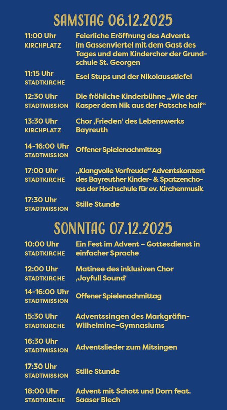 Das Veranstaltungsprogramm bietet ein breites Spektrum: vom Familiengottesdienst „Esel Stups und der Nikolausstiefel“ über die fröhliche Kinderbühne „Wie der Kasper dem Nik aus der Patsche half“, das Konzert des Bayreuther Kinder- und Spatzenchores an der Hochschule für Evangelische Kirchenmusik bis hin zum Adventskonzert mit Schott & Dorn featuring Saaser Blech. Eine bunte Vielfalt an kulturellen Angeboten lädt zum Mitmachen und Genießen ein.